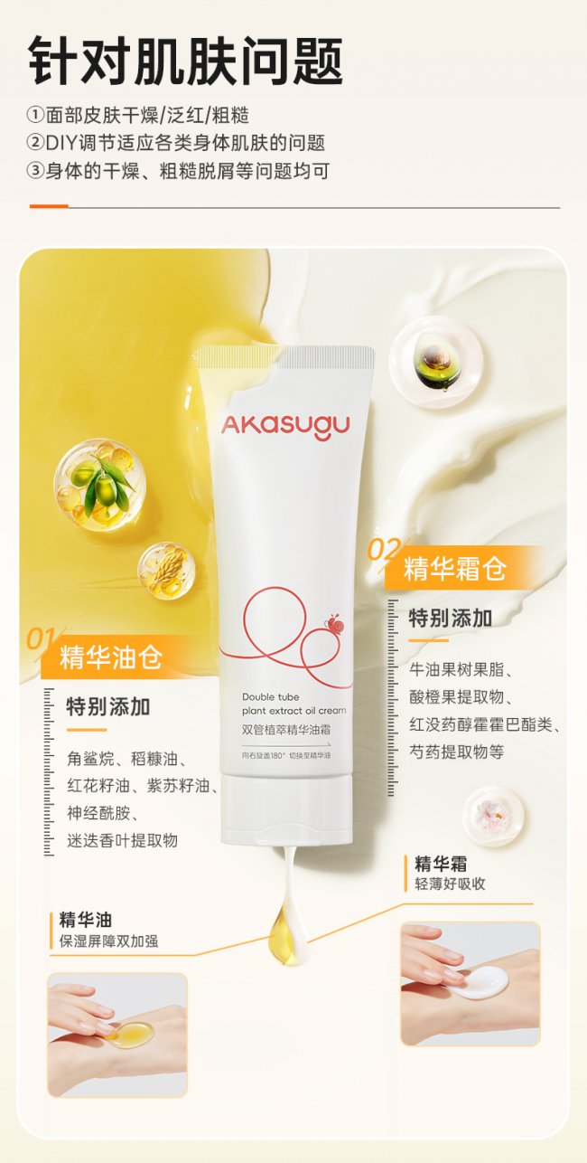区别于传统面霜固定的质地与滋润度,这款产品采用精华油仓 + 精华霜仓双管锁鲜设计,核心优势体现在 3 点: